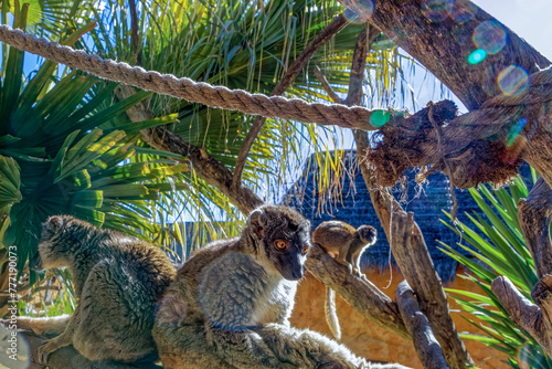 Fototapeta premium A small family of Northern Bamboo Lemurs from Madagascar sitting in the sun at a wildlife park near Oudtshoorn, Western Cape South Africa