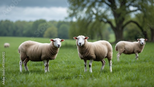 © CreativeBro, Fototapeta premium A small flock grazing under overcast skies