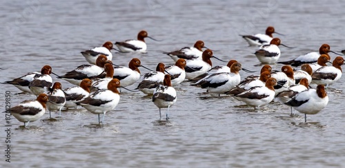 © Leanne, Fototapeta premium A small flock of Red-necked avocets (Recurvirostra novaehollandiae) resting in shallow water on the edge of a lake. Esperance Western Australia.