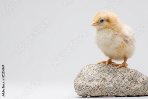 © Sulaihatin, Fototapeta premium A small fluffy yellow chick stands atop a grey stone