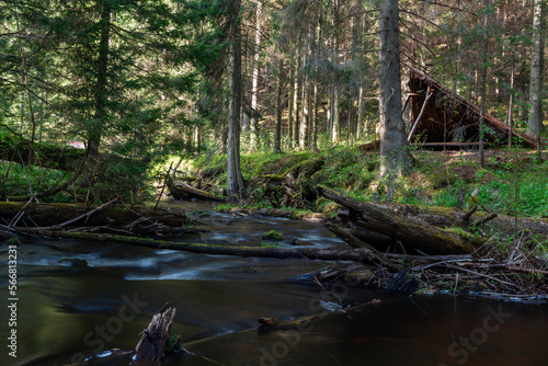 © EriksZ, Obraz premium A small forest river flowing through a spruce forest