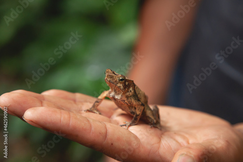 Obraz premium A small frog on the palm of the hand, inhabitant of the Amazon rainforest, like many other amphibians, animals and plants, in the Manu National Park