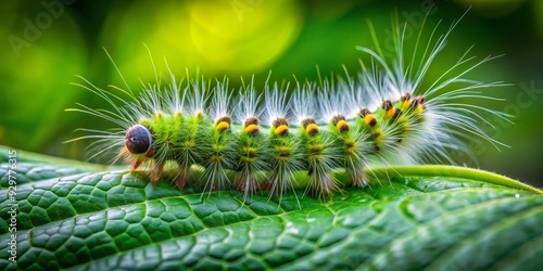 Naklejka premium A small, fuzzy caterpillar with bright green body and white stripes slowly...