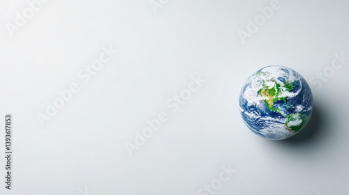 Fototapeta premium A small globe model resting on a minimalist white surface, showcasing continents and oceans, and symbolizing global unity and environmental awareness.