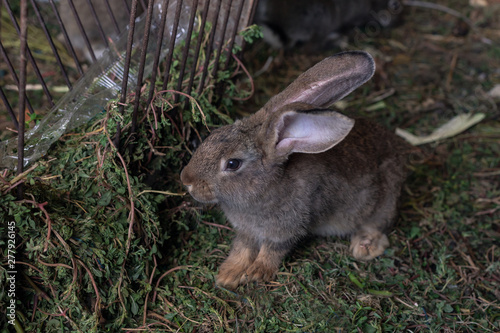 © Anka, Fototapeta premium a small gray-brown rabbit sitting on the grass near the feeder