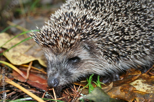 © Andrey, Fototapeta premium A small gray hedgehog looks into the photographer's camera.