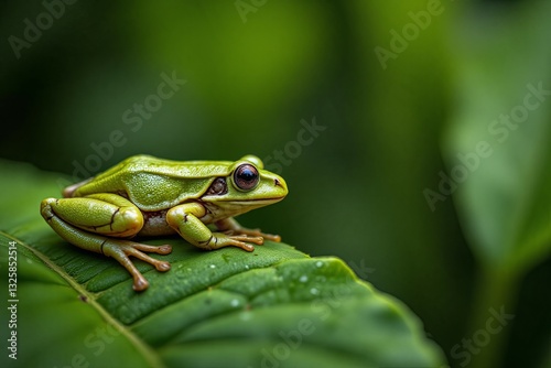 © RESTY, Naklejka premium A small green frog rests upon a large leafy surface