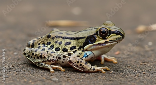 Fototapeta premium A small green frog with black spots sits on a textured surface.