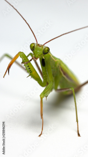 © CreativeSuburb, Fototapeta premium A small green mantis on a light background