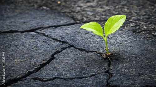 Naklejka premium A small green plant emerges from cracked asphalt, symbolizing resilience and...