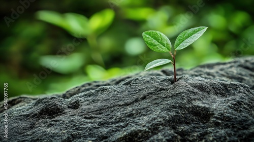 © soem, Naklejka premium A small green plant growing on a rocky surface with a blurred green background.