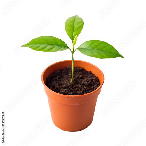 © Gralysell, Naklejka premium A small green plant seedling growing in a terracotta pot with dark soil isolated on transparent background