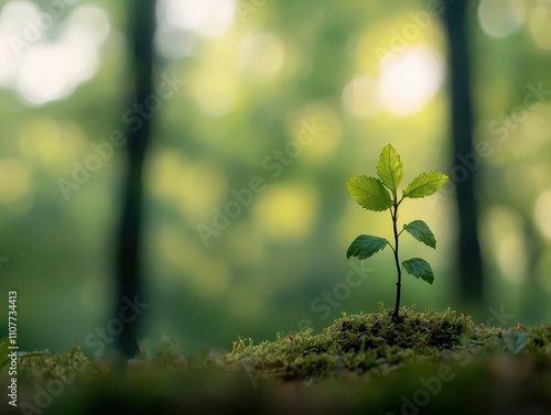 Fototapeta premium A small green plant sprouts from the ground, surrounded by soft moss and a blurred forest background, symbolizing growth and nature.