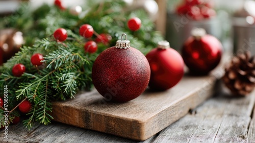 Fototapeta premium A small green tree with red berries sits on a table close to a fire pit,...