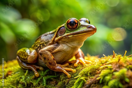 © Four888, Fototapeta premium A small, greenish-brown rain frog with large golden eyes and webbed feet perches on a moss-covered rock, blending