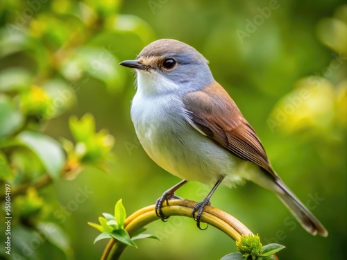 © Man888, Fototapeta premium A small, grey-and-white bird with a distinctive silver ring around its eye, perched on a branch, surrounded by lush green foliage and soft natural light.