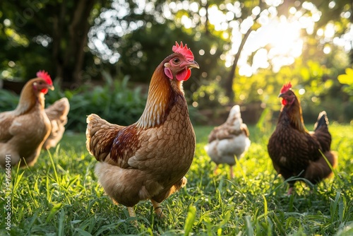 Fototapeta premium A small group of chickens is standing together in a grassy field