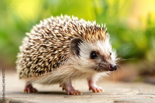 Fototapeta premium A small hedge is sitting on top of a wooden floor, potentially used for...