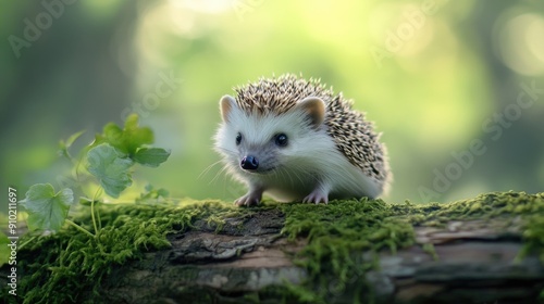 © MK, Fototapeta premium A small hedge sits atop a moss-covered log, surrounded by lush greenery