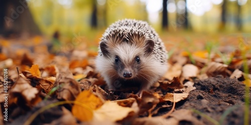 Naklejka premium A small hedge sits atop a pile of dry leaves, perhaps abandoned or waiting to...