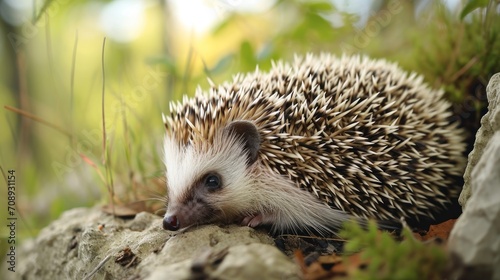 © Olga, Fototapeta premium a small hedge sitting on top of a rock next to a pile of leaves and grass on top of a pile of leaves on top of a pile of rocks.