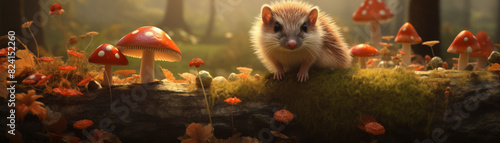 © Wonderful Studio, Obraz premium A small hedgehog is sitting on a log in a forest with many red mushrooms