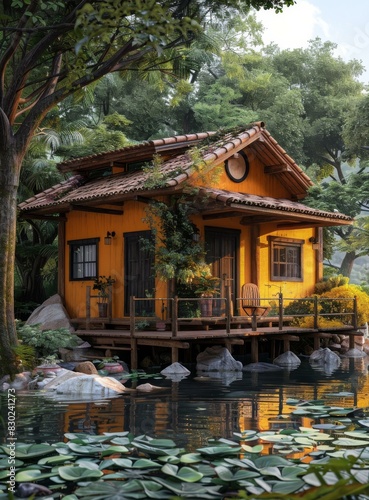 © duyina1990, Obraz premium A small house in the middle of a pond surrounded by a forest