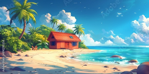 © ArtCookStudio, Obraz premium A Small House on a Tropical Island Beach With Palm Trees and Blue Skies