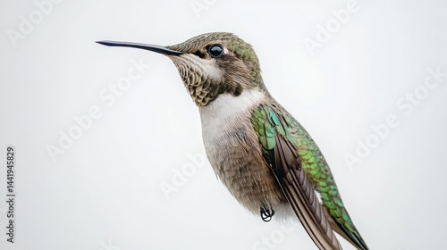 © Creations Photo , Fototapeta premium A small hummingbird perched with wings folded, against a white backdrop