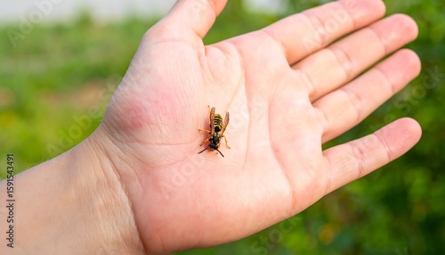 © Bandi, Obraz premium A small insect rests on a hand outdoors