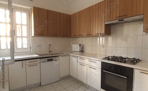© visoot, Fototapeta premium A small kitchen with light brown cabinets and wooden cupboards, a small black stove top with an empty space for an air conditioner built-in under the sink. White tiles on the floor. Generative AI.