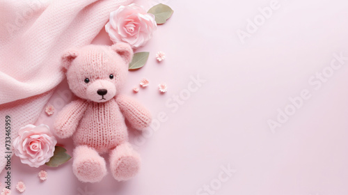 © Irina B, Obraz premium A small knitted amigurumi bear toy on a pink blanket, on a pink background. Flat lay, top view, copy space. space for text