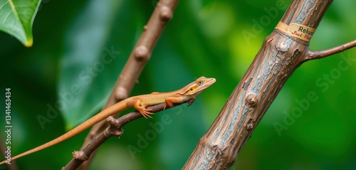 © Sanook, Naklejka premium A small lizard basks on a tree branch, a blurred green leaf backdrop, natural light, macro