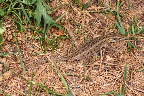 Naklejka premium a small lizard hid in the grass, close-up, in its natural environment