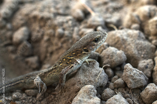 © Михаил Жигалин, Naklejka premium A small lizard sits on the plowed soil of a field.