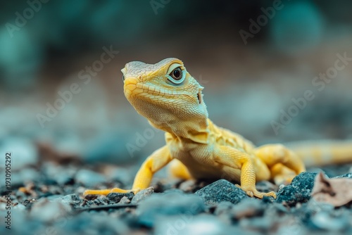 Fototapeta premium A small lizard stands attentively on a rock covered with moss.
