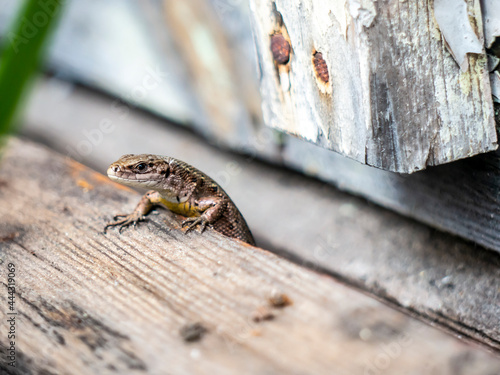 Naklejka premium A small lizard with a tail basks in the sun in the summer sitting on wooden...