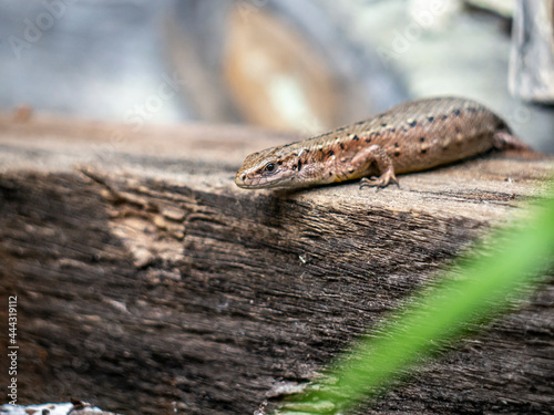 Naklejka premium A small lizard with a tail basks in the sun in the summer sitting on wooden...
