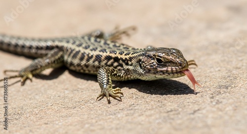 Naklejka premium A small lizard with dark mottled patterning on its back and sides, light underbelly, and a pink tongue extended, rests on a light brown, sandy textured surface