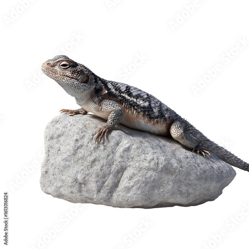© PNG, Naklejka premium A small lizard with intricate patterns rests on a textured grey rock, isolated on white on transparent background