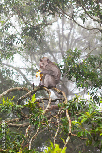 Fototapeta premium A small monkey sitting on a tree and eats banana