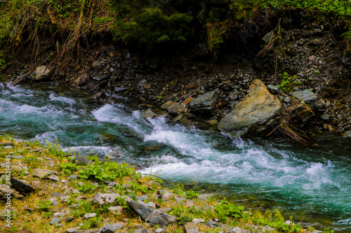 Obraz premium A small mountain cold stream drains quickly from the mountains.