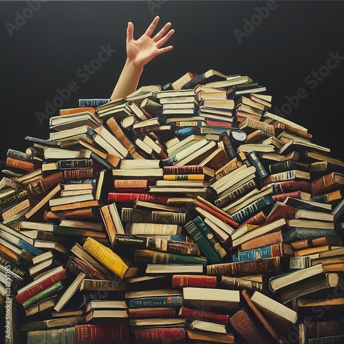 Obraz premium a small mountain of books and one hand reaching out from the bottom