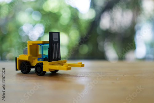© Dontree, Obraz premium A small of yellow forklift model on wood table. Small toy yellow forklift