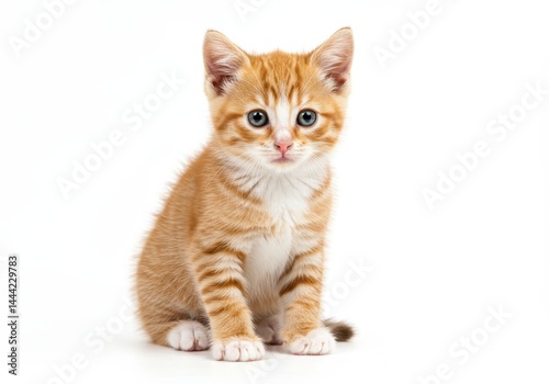 © Muaz, Obraz premium A small orange tabby kitten sitting upright on a white background looking directly at the camera