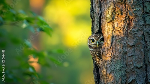 © Arifin Studio, Obraz premium A small owl peeks out from behind a tree trunk in a forest, with a blurred background of green leaves and sunlight.