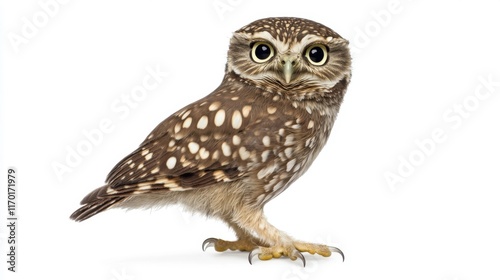 © Artittaya, Naklejka premium A small owl tilting its head inquisitively, highlighted against a pure white backdrop