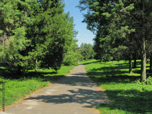 © adamchuk_leo, Obraz premium A small path among tall trees and green, lush grass. I wonder where she leads