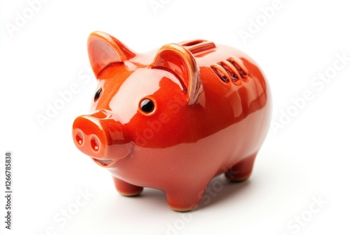 © Fotograf, Obraz premium A small piggy bank with a bright red color sits on a plain white surface, ready for savings