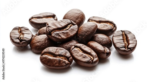 © Pic, Obraz premium A small pile of roasted coffee beans, isolated on a white background.
